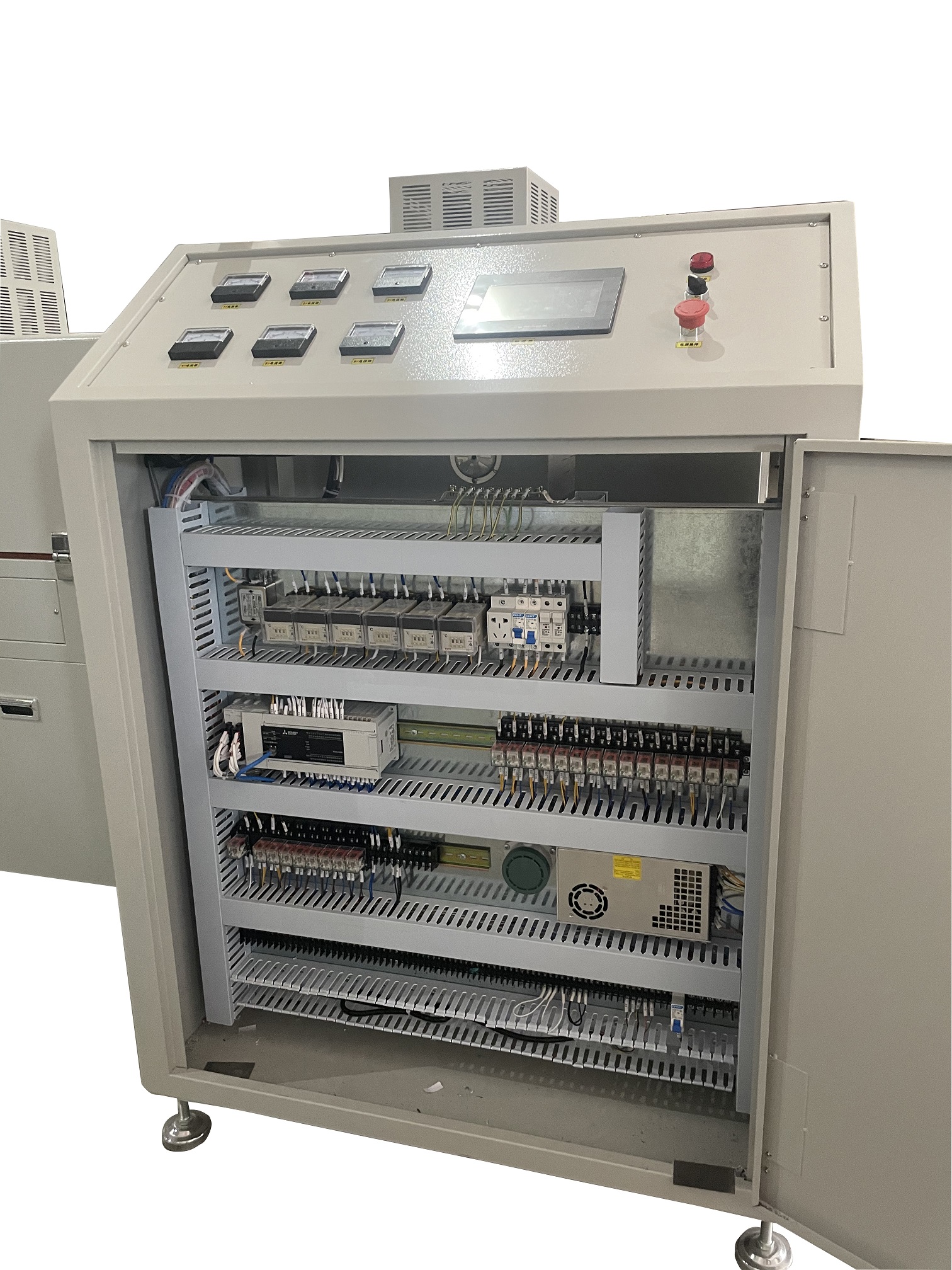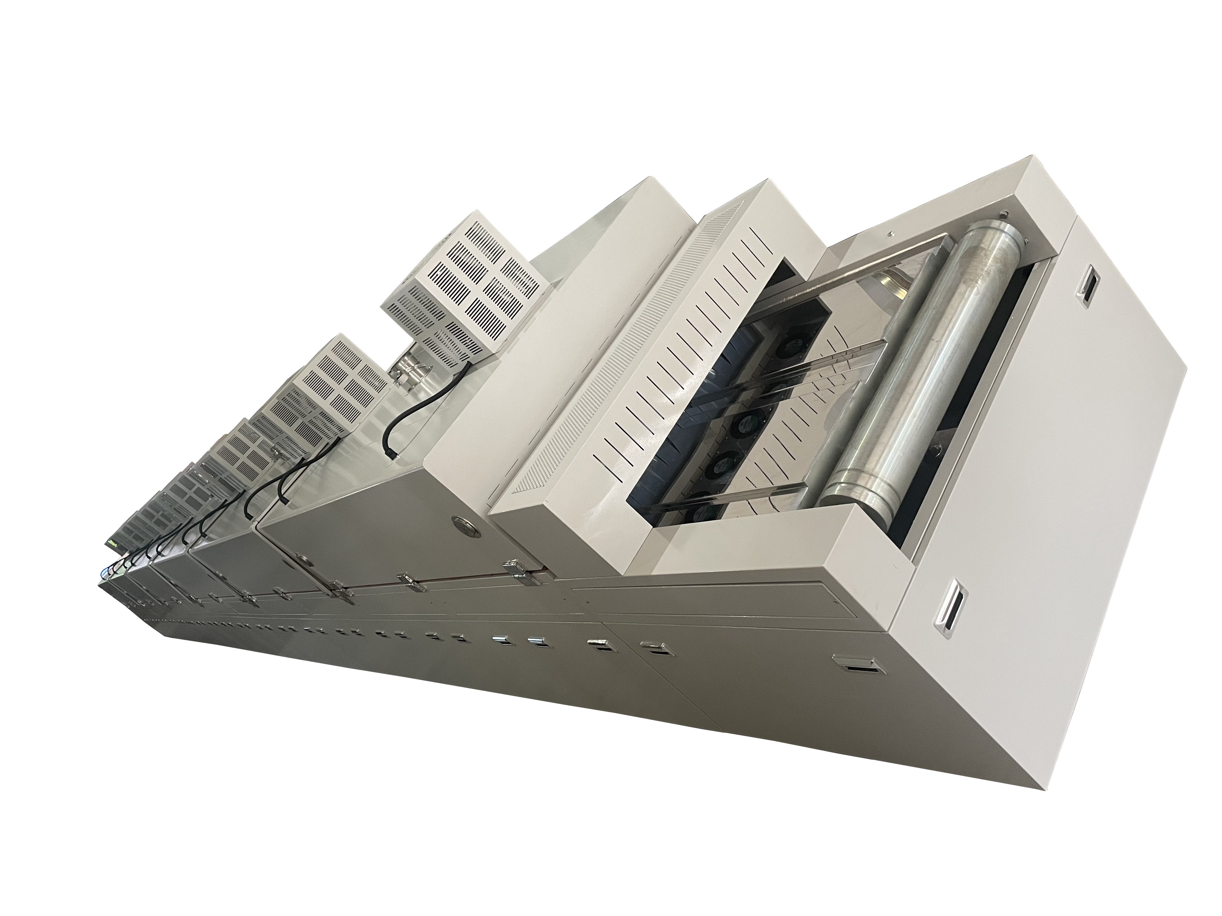 2、三個溫區(qū)分兩節(jié)爐蓋。產(chǎn)品進(jìn)料高度為220mm、進(jìn)料寬度為870mm,出口段內(nèi)部高度為790mm(配3個自動升降門);烘干部分總長3350mm,